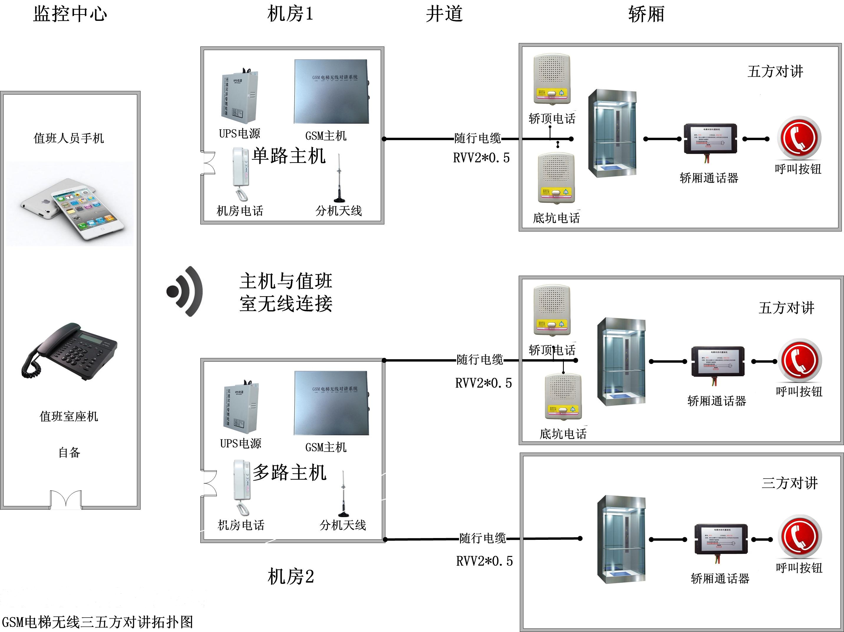 安裝方法:電梯無(wú)線對(duì)講主機(jī)安裝在電梯機(jī)房。首先使用劃線器標(biāo)出安裝位置,用電鉆鉆孔,將螺栓把主機(jī)固定好。最好安裝在離門(mén)窗近的地方方便無(wú)線信號(hào)的接收和發(fā)射,把12V-UPS電源插在電源接口上,打開(kāi)電源,看電源燈是否已變亮,看主機(jī)側(cè)面電源燈是否變亮,變亮表示主機(jī)已處于正常工作狀態(tài),把機(jī)房電話接入電話接口處,最后再插入控制線到通話器接口上,把控制線上的兩條(黃綠)線接入準(zhǔn)備好的兩條隨行電纜上,這時(shí)機(jī)房設(shè)備已全部安裝完備(注:每臺(tái)主機(jī)可接三臺(tái)電梯)。